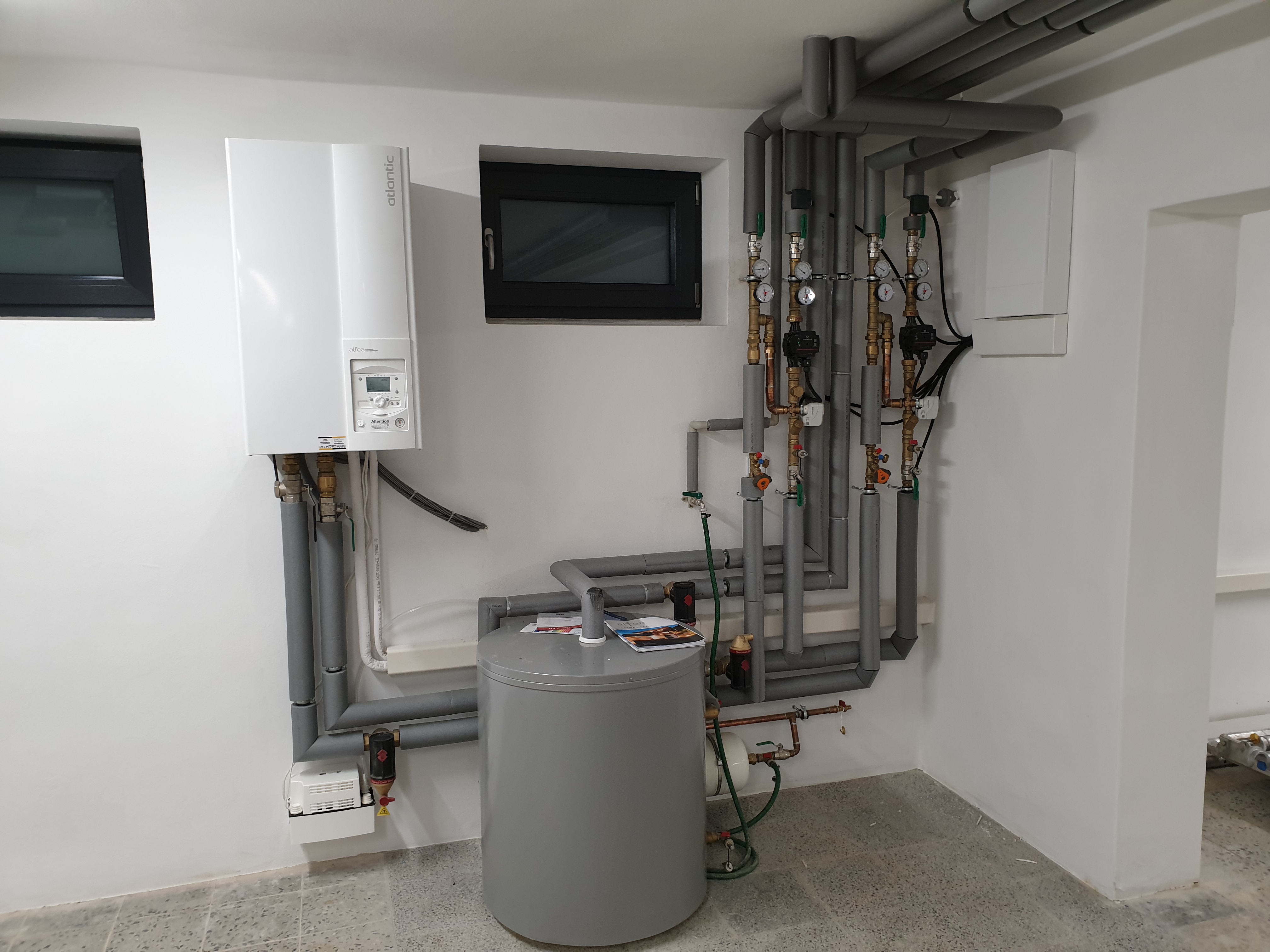 V budově jsou dvě kanceláře, zasedací místnost a společenská místnost. Společenská místnost pojme zhruba 70 lidí, nechybí u ní kuchyňka. Systém vytápění je tvořen kombinací otopných těles a podlahového vytápění. Zdrojem vytápění je splitové tepelné čerpadlo vzduch/voda v kombinaci s plynovým kondenzačním kotlem (bivalentní zdroj / hybridní zdroj). Tepelné čerpadlo pokrývá monovalentně potřebu tepla na vytápění do venkvní teploty -5°C. Při nižších teplotách, či při potřebě rychlého natopení společenské místnosti je přiřazen kondenzační kotel.