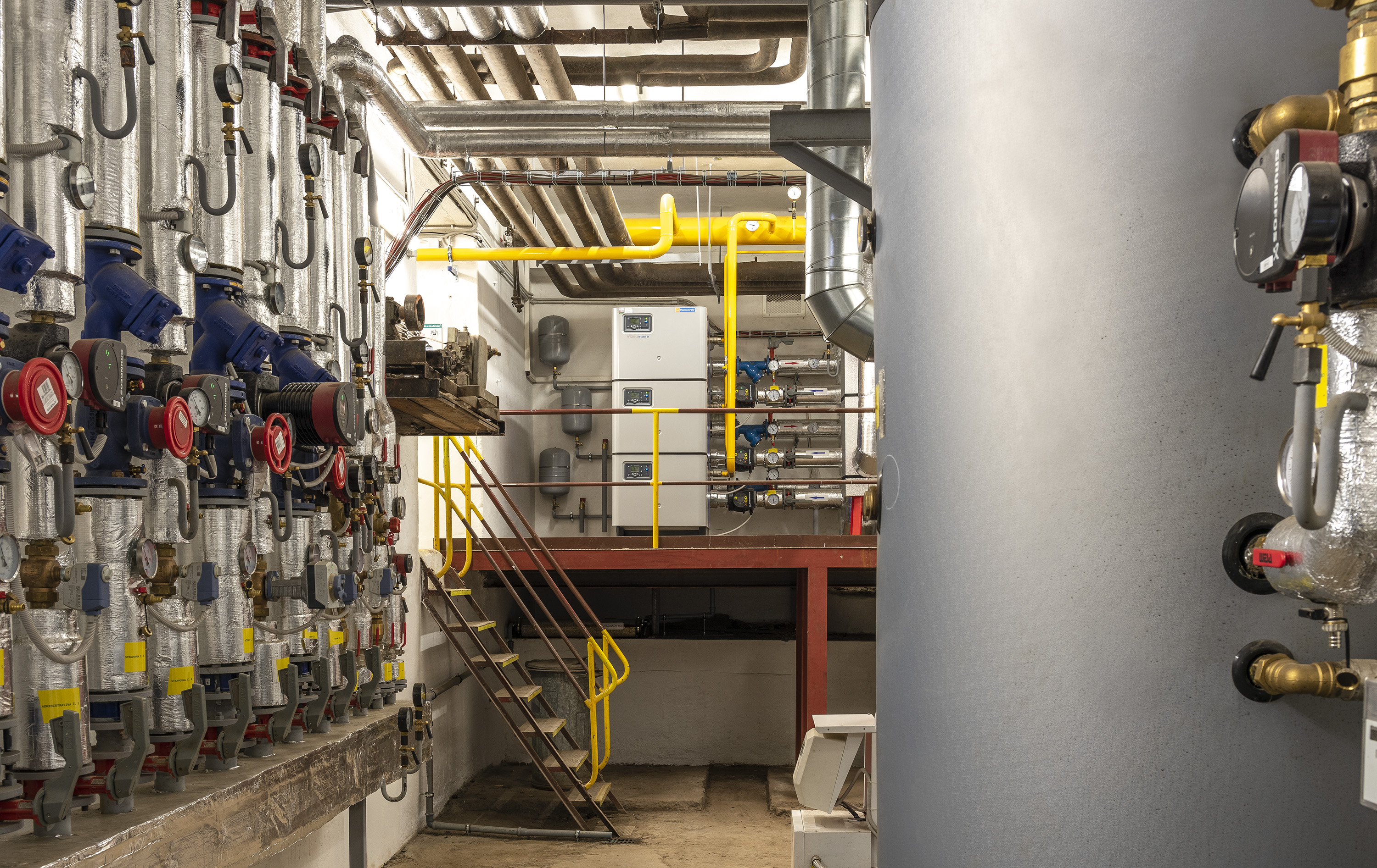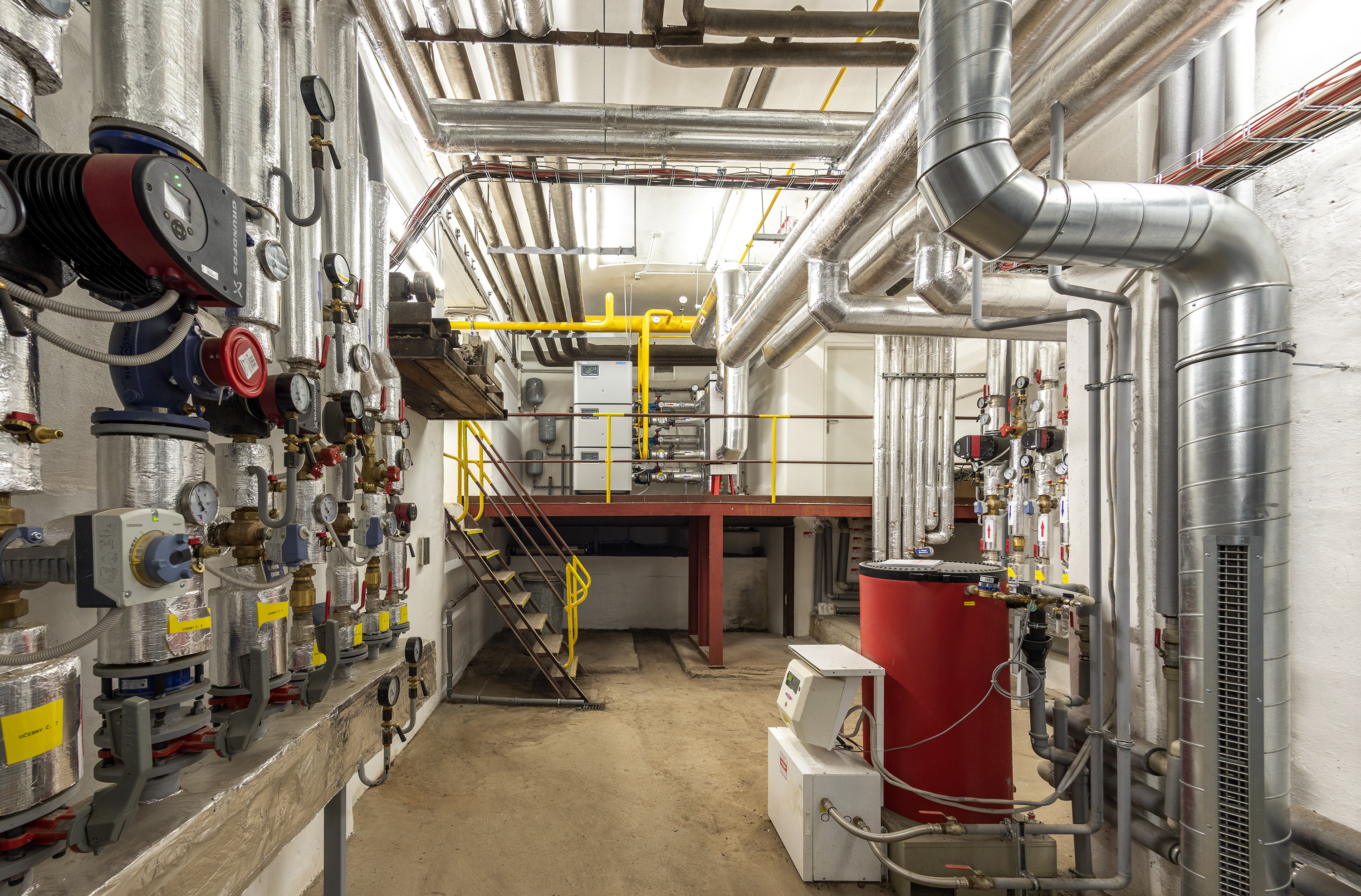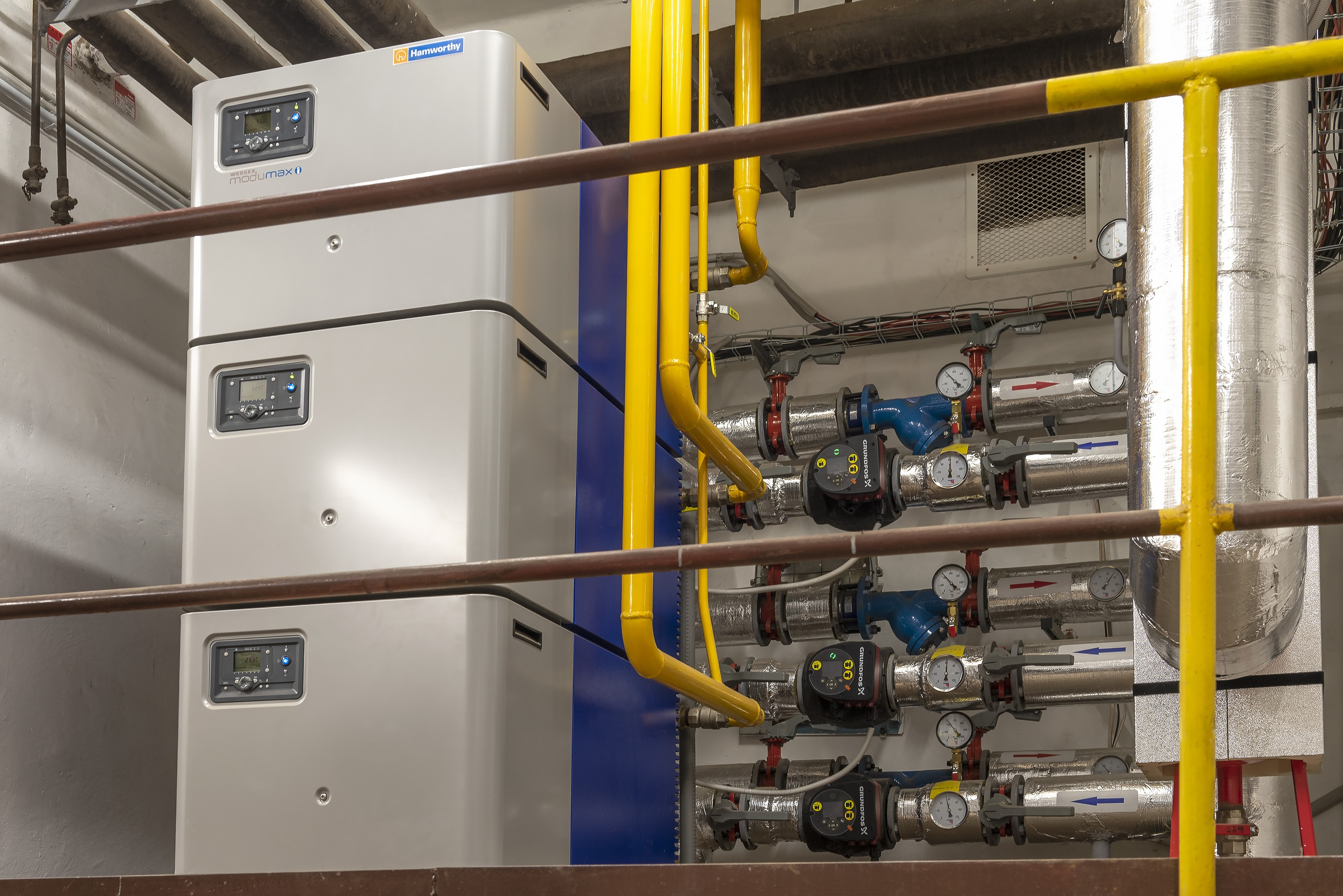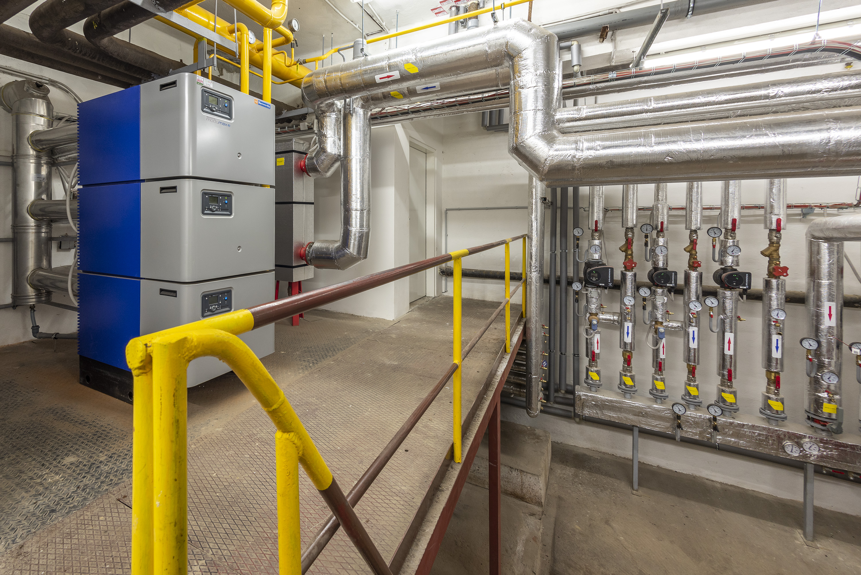 Odpojení od dálkového tepla a vybudování nové kotelny. Výrobu tepla zajišťuje zcela nová technologie stacionárního kondenzačního kotle Varblok ModuMax mk3 196/588 od výropce Groupe Atlantic o celkovém jmenovitém výkonu 586,8 kW při 80/60 °C (3 x 195,6 kW při 80/60 °C). Vzhledem k tomu, že se jedná o stávající otopnou soustavu, jsou použity nové plynové kondenzační kotle s nerezovým výměníkem, které jsou odolnější na zhoršenou kvalitu topné vody. S ohledem na malý prostor kotelny jsme díky modelu Varblok ModuMax instalovali velmi vysoký výkon na malém prostoru. Ohřev vody je zajištěn pomocí ohřívače Austria Email HRS 900 o objemu 900 l. Pro odvod kondenzátu je použitý neutralizační box NEUTRAKON 1000/650 Air.
